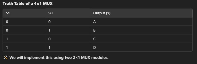 In this blog, we will design a 4×1 MUX using 2×1 MUX modules in Verilog, explaining the hierarchy and working principles.