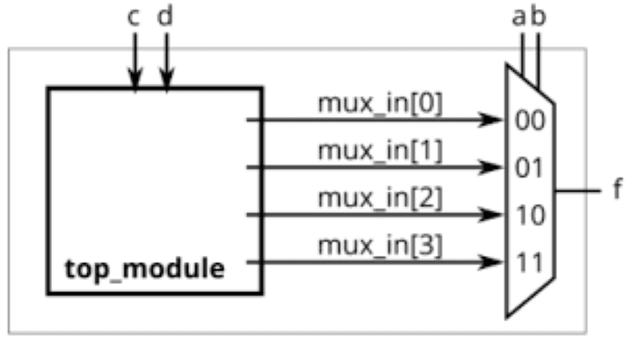 For the following Karnaugh map, give the circuit implementation using one 4-to-1 multiplexer and as many 2-to-1 multiplexers as required, but using as few as possible. You are not allowed to use any other logic gate, and you must use a and b as the multiplexer selector inputs, as shown on the 4-to-1 multiplexer below.