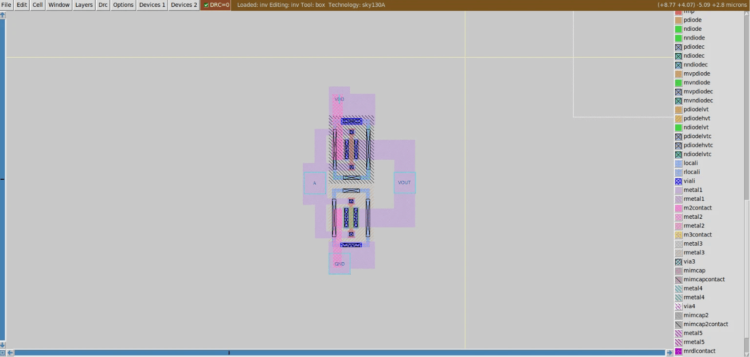 After completing the schematic design and simulations, the next step was to translate the inverter circuit into a physical layout using Magic VLSI, an open-source layout editor compatible with the Sky130 process. The layout defines how transistors, metal layers, and interconnections are physically realized on silicon.