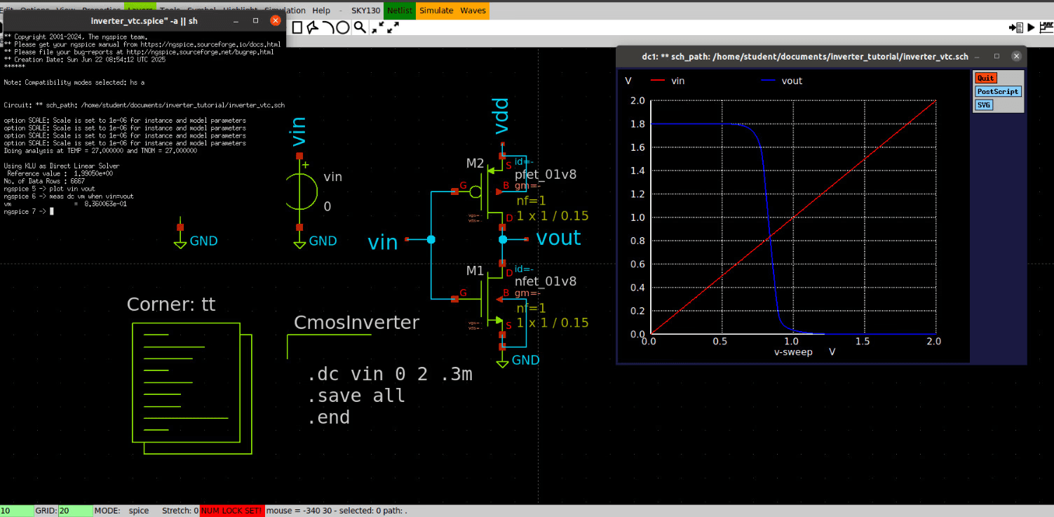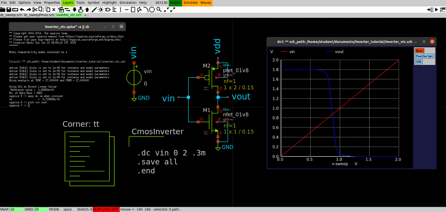 To analyze the static behavior of the CMOS inverter, I performed a DC sweep simulation in ngspice. The goal of a DC sweep is to determine how the inverter’s output voltage (Vout) varies as the input voltage (Vin) transitions from 0 V to the supply voltage (VDD). This helps identify the inverter’s switching threshold, also known as the trip point (Q-point), which is the input voltage at which the output voltage transitions sharply from high to low.