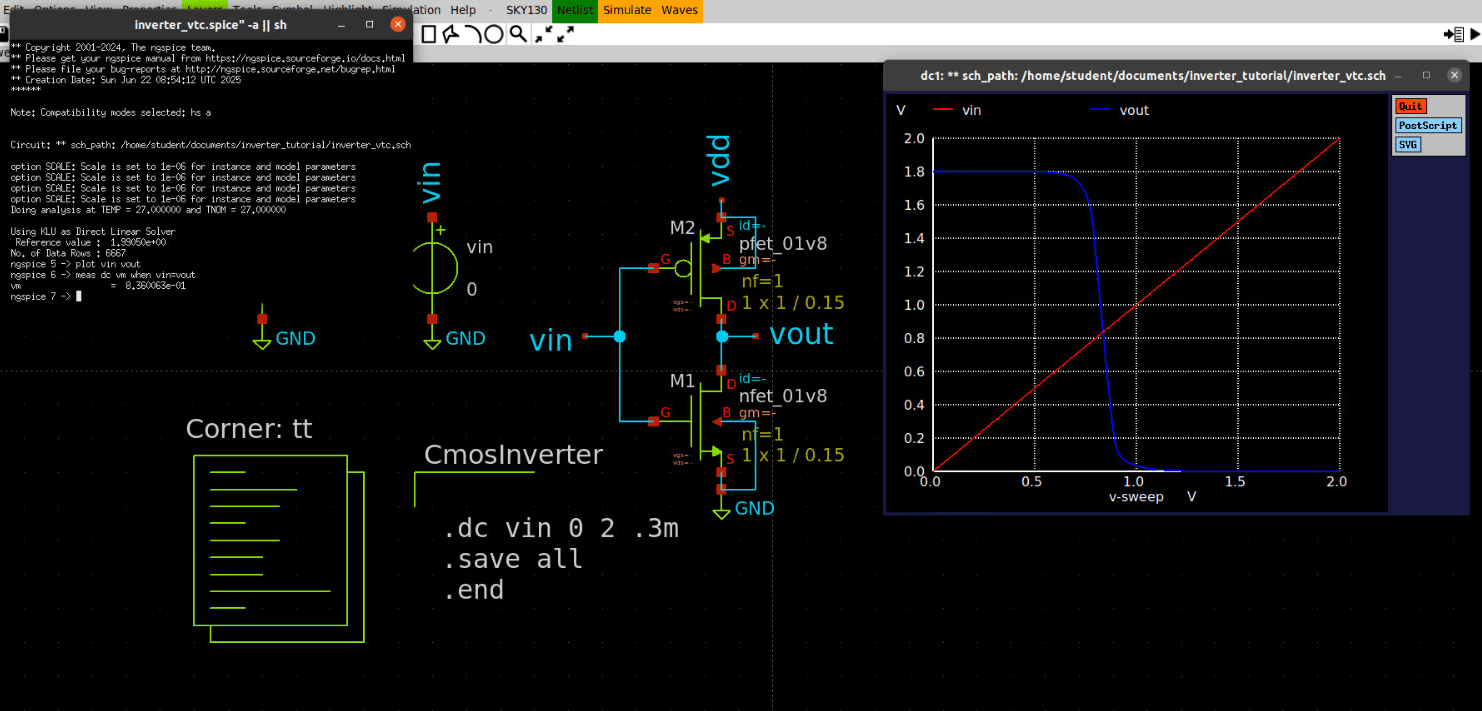 In this project, we explore the full custom design flow of a CMOS inverter using the Skywater 130nm process (Sky130). We begin by designing the inverter schematic in Xschem, performing detailed electrical simulations in ngspice to analyze its behavior, and proceeding to create a layout in Magic. Finally, we verify the design through Design Rule Check (DRC) and Layout Versus Schematic (LVS) checks, ensuring the physical layout matches the intended circuit functionality.